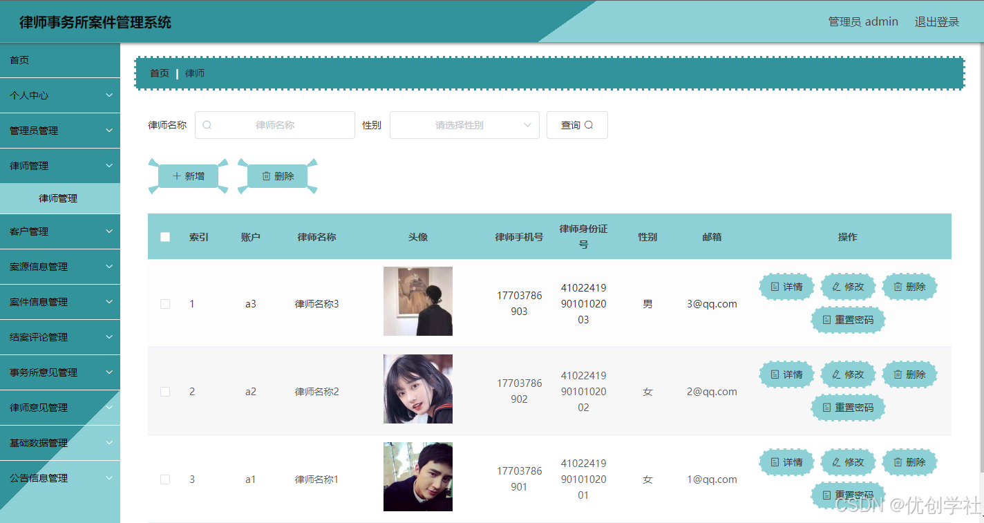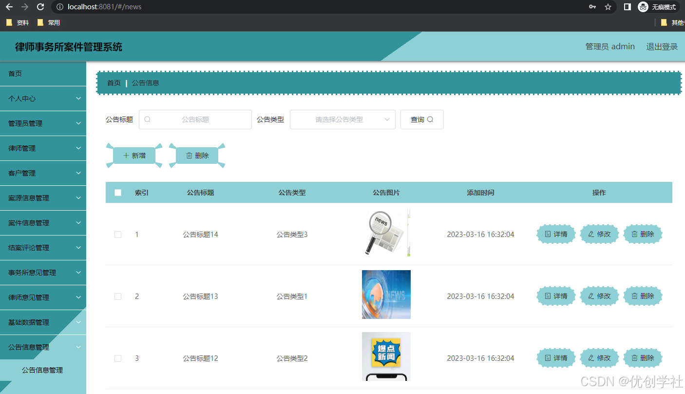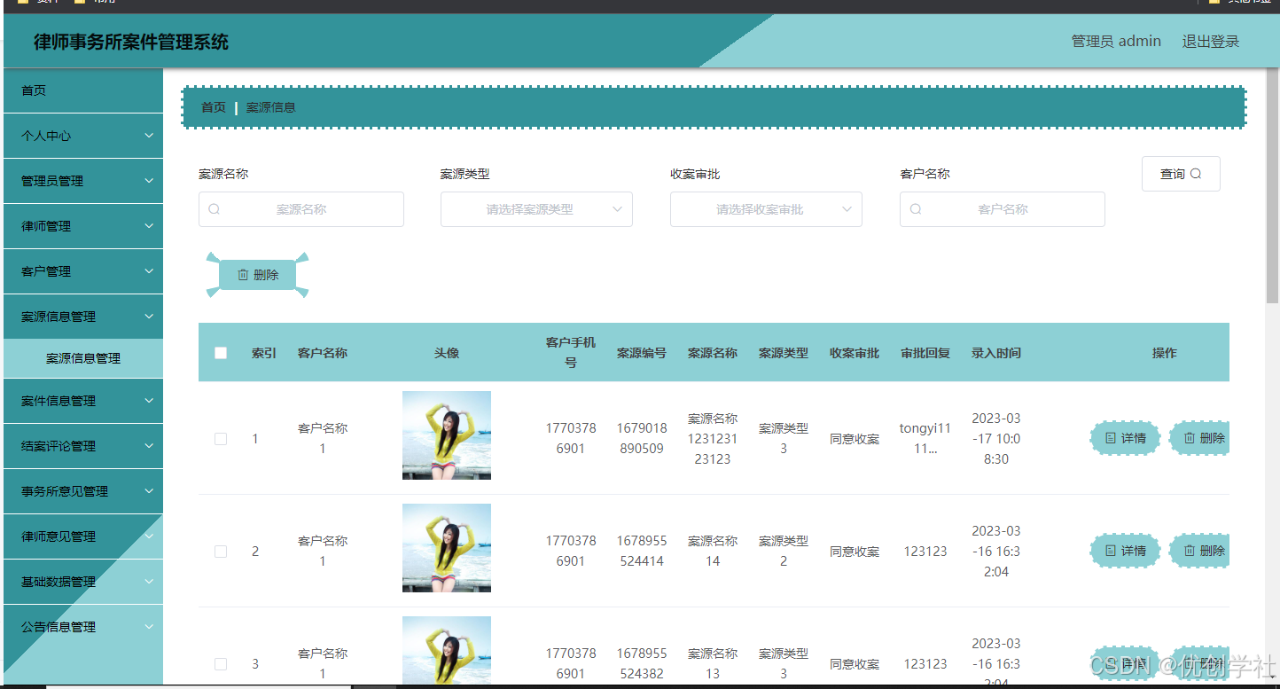 通过如图5.3显示的就是案源信息管理页面,此页面提供给管理员的功能有:根据案源信息进行条件查询,还能够对案源信息进行新增、修改、查询操作等等。