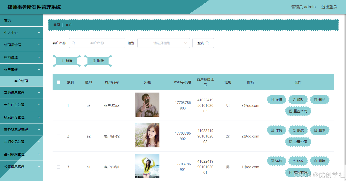 客户信息管理页面,此页面提供给管理员的功能有:客户信息的查询管理,可以删除客户信息、修改客户信息、新增客户信息,就是如图5.1显现的就