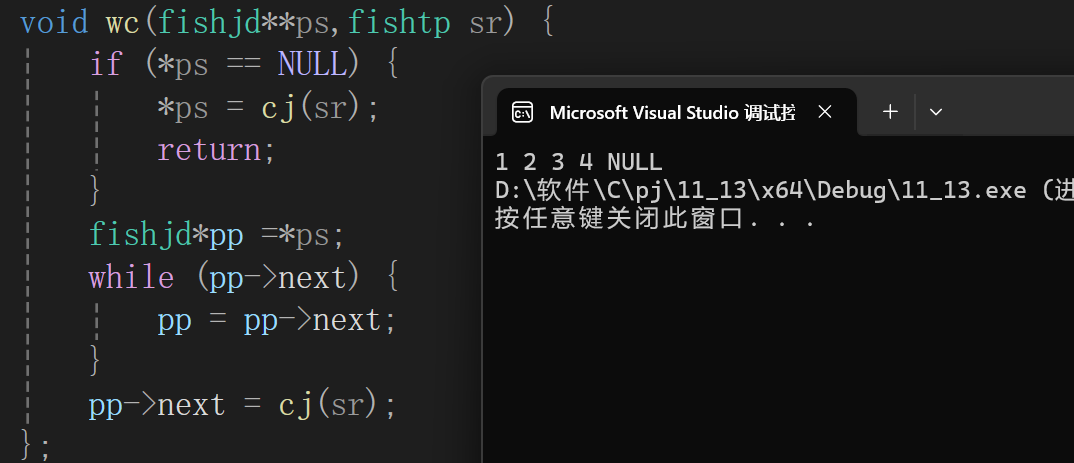 void wc(fishjd**ps,fishtp sr) {//改变为传递链表的地址