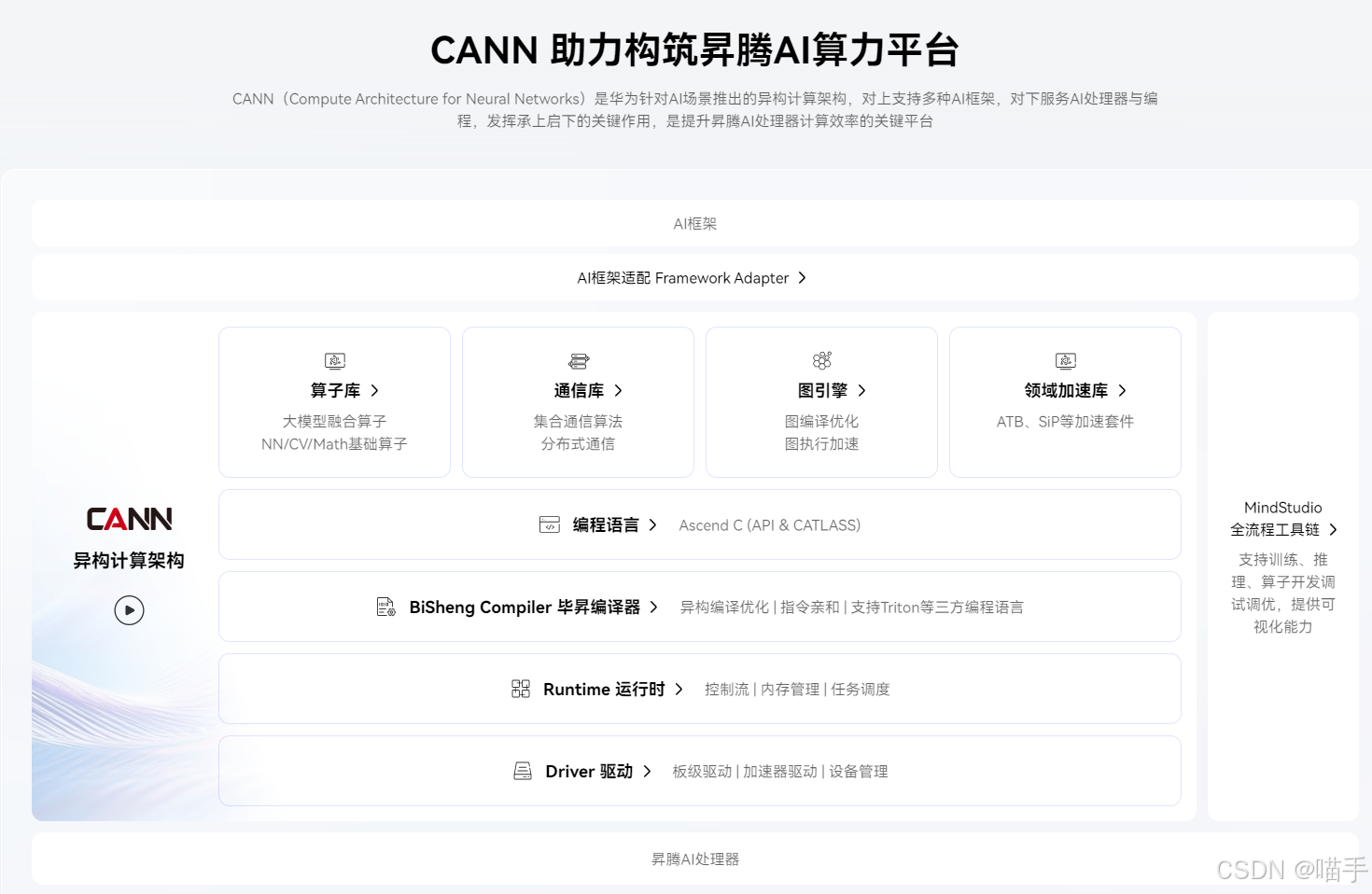 华为的CANN架构正是为了解决这一痛点而生。CANN全称Compute Architecture for Neural Networks,是一个面向AI场景的异构计算架构,覆盖了从云端训练到边缘推理的全流程。