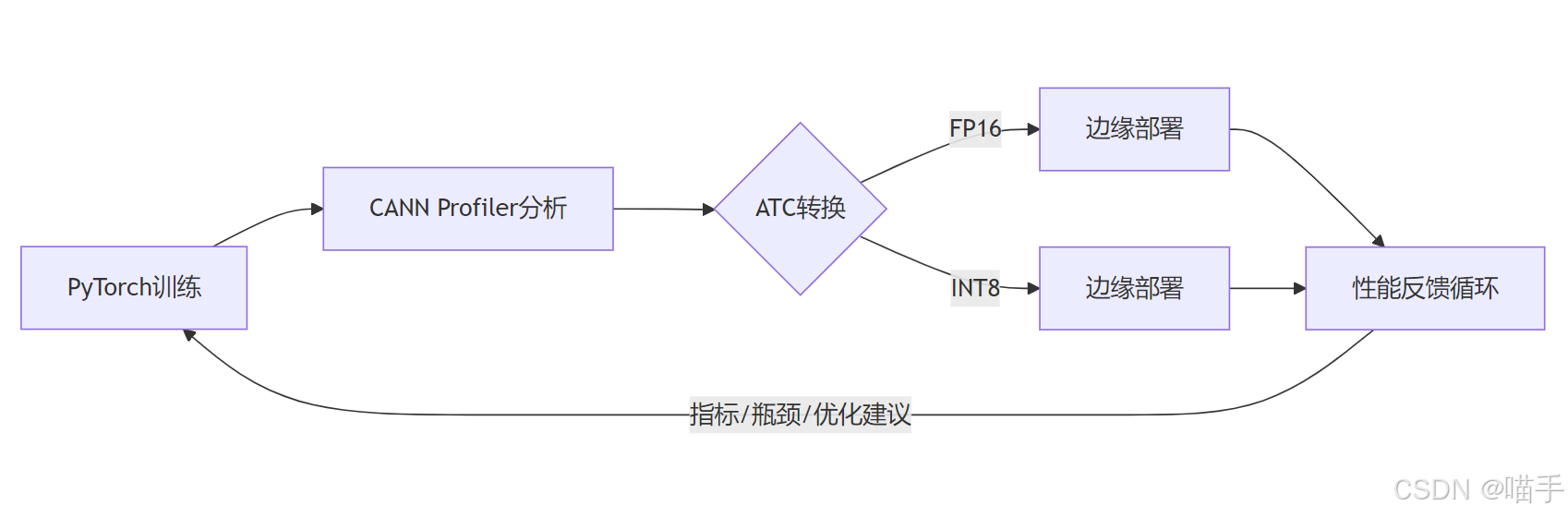 CANN的"端云一致"理念为我们提供了打通这两个态的可能性。我们的核心思路是:让模型从训练到部署的每一步都在CANN生态内完成,形成一个闭环。