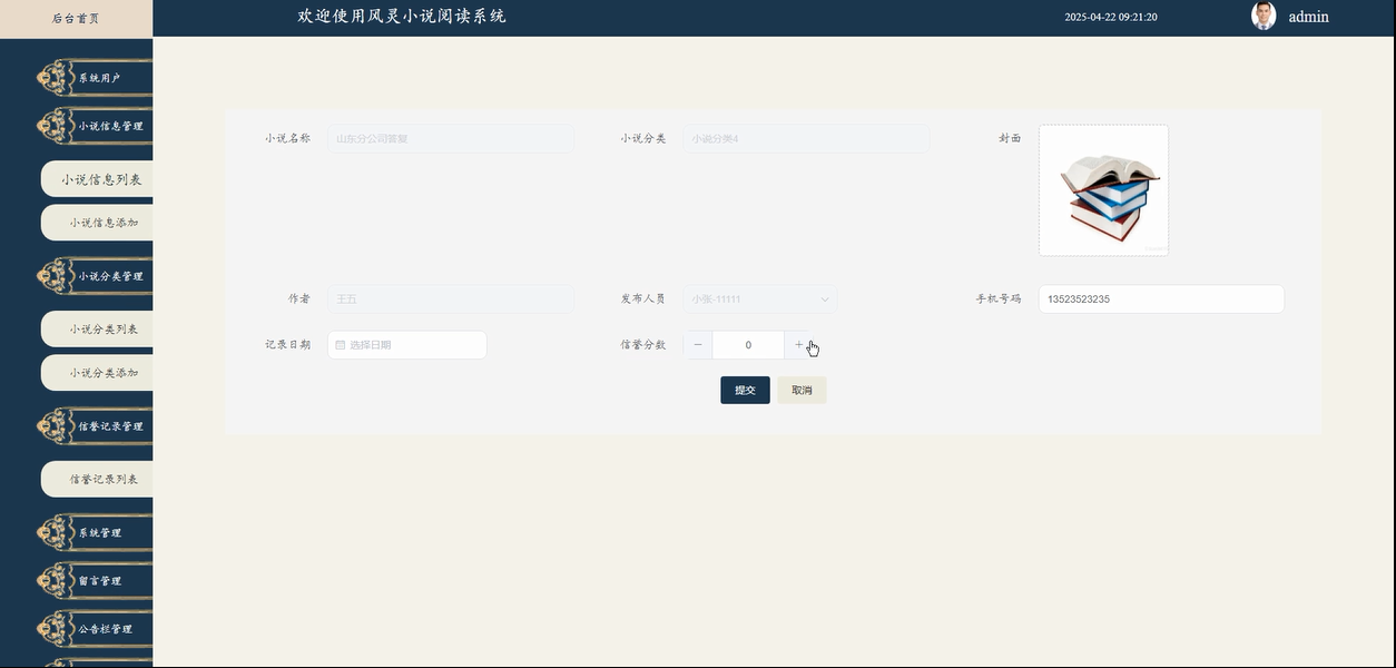 - 小说信息管理:管理员行查看、添加或删除小说信息,确保平台上的小说内容准确无误。同时,管理员还可以管理小说内容的设置,包括对评论的查看、删除和修改,保证小说内容的质量与互动的正向性。