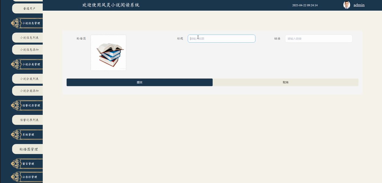 - 系统管理:管理员行管理平台的轮播图展示内容,包括查看、添加和删除轮播图。轮播图通常用于展示关键活动、最新更新或推荐内容,是平台吸引用户注意力的要紧组成部分。