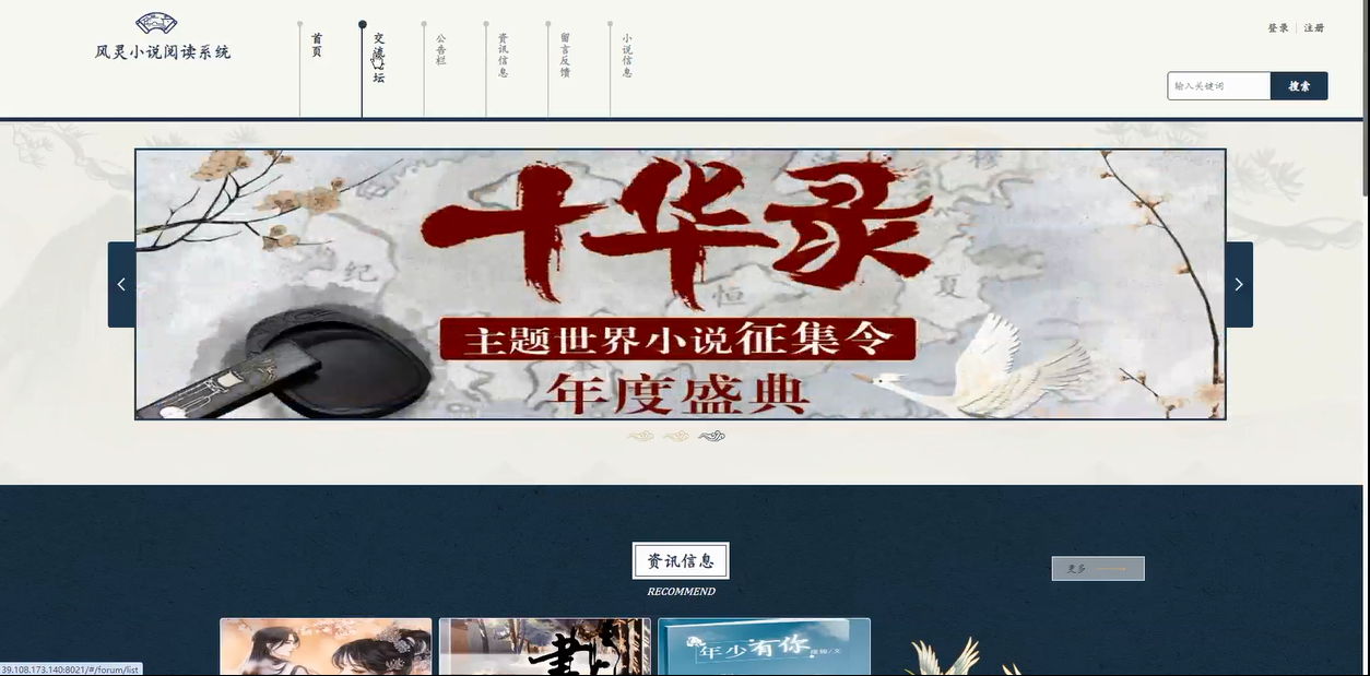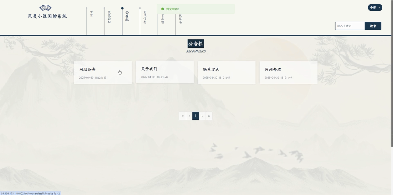 - 通过首页:首页是用户进入系统后看到的第一界面,展示了动态轮播图、推荐小说、资讯信息、以及公告等内容。轮播图展示最新的活动、更新的小说或热门信息,而推荐小说和资讯信息能够辅助用户更快捷地发现自己感兴趣的内容。公告栏则为用户提供平台的主要通知和信息。