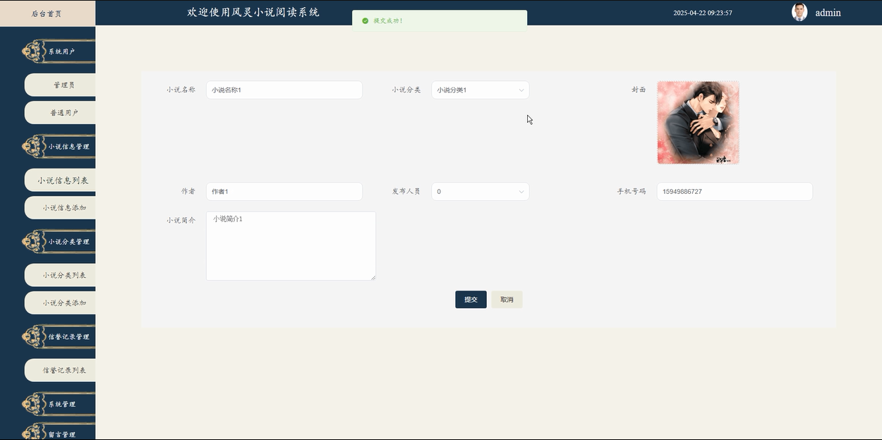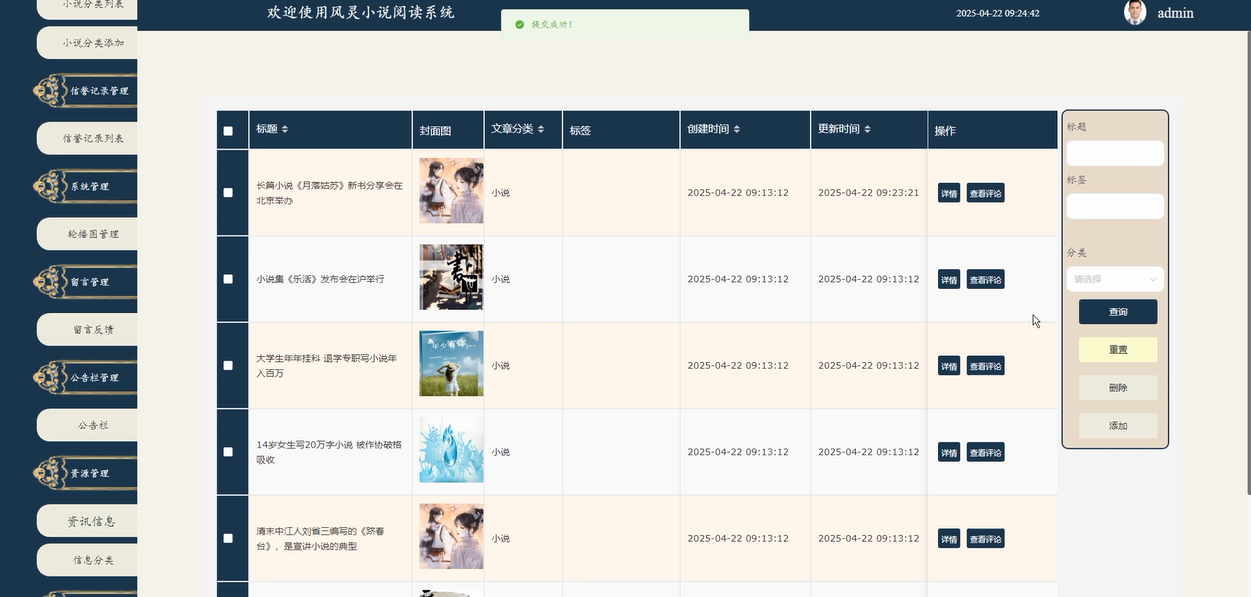 - 通过小说分类管理:管理员能够管理小说的分类,包括查看、添加和删除分类,以便用户更好地浏览和查找自己感兴趣的内容。通过合理的分类管理,管理员确保平台内容结构的清晰性和用户体验的优化。