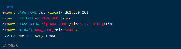 vim /etc/profileexport JAVA_HOME=/usr/local/jdk1.8.0_261 export JRE_HOME=${JAVA_HOME}/jre export CLASSPATH=.:${JAVA_HOME}/lib:${JRE_HOME}/lib export PATH=${JAVA_HOME}/bin:$PATH\