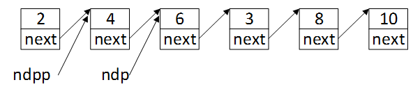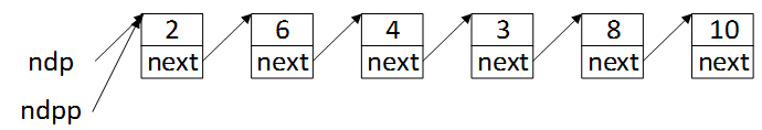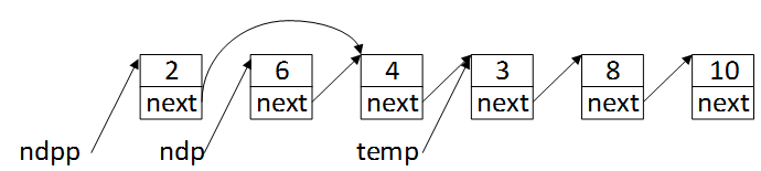 然后将ndpp往后移一个位置,ndpp = ndpp->next,指向第二个结点,虽然此时值为6的结点的next指针尚未改变,但是此时第二个结点应该是值为4的那个结点了。