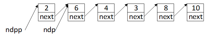 第一次外循环,i=0。进入内循环,j=0。首先对比第一个结点与第二个结点,2小于6,ndp指向下一个结点,即6,ndpp不变,仍然指向2。指针指向如下: