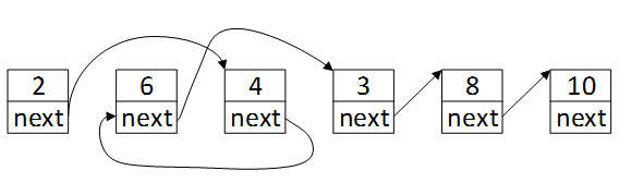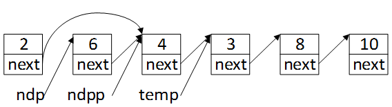 再将值为4的结点的next指针指向值为6的结点,ndp->next->next = ndp。