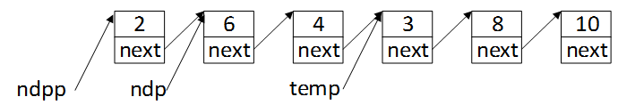 最后将值为6结点的next指针指向值为3的结点,ndp->next = temp;这样就完成值为6和值为4两个结点在链表位置的交换,同时ndp指针和ndpp指针在链表位置均往后移了一位。
