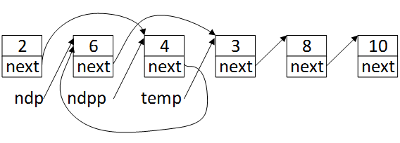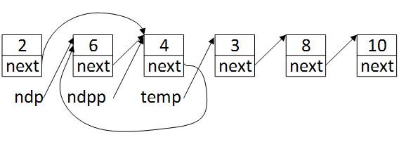 可以看到,虽然只是调整两个结点的位置,但是需要对三个结点的next进行操作,这也是为什么程序里需要有ndpp指针,因为ndp指针指向当前结点(值为6),但是交换结点需要用到当前结点的上一个结点(值为2)的next指针,因此需要一个ndpp指针指向当前结点的前一个结点。交换结点过程具体如下,回到图3,首先保存第四个结点的地址到一个暂存变量temp,temp = ndp->next->next。
