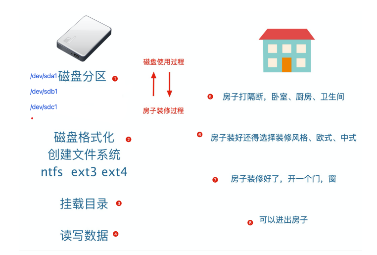 磁盘要存数据,相当盖房子磁盘要分区好后才能够存入数据相当于房子盖好后要个隔断出,厨房,卫生间,卧室。。磁盘分完区后,还得格式化,且创建文件的系统后才可以存入数据,相当于装修后才可以入住,不同的文件有不同的装修风格磁盘的分区,格式化,还得挂载到不同的文件夹才能放数据,相当于安装门,窗,才能于外界通信。