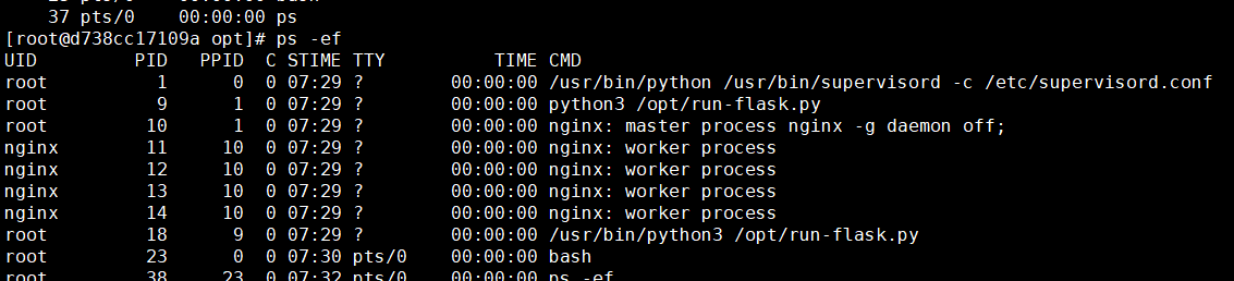 # 进入容器内,查看进程的关系,明确supervisor是nginx,flask的父进程