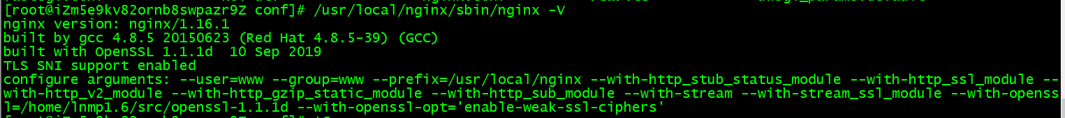 --user=www --group=www --prefix=/usr/local/nginx --with-http_stub_status_module --with-http_ssl_module --with-http_v2_module --with-http_gzip_static_module --with-http_sub_module --with-stream --with-stream_ssl_module --with-openssl=/home/lnmp1.6/src/openssl-1.1.1d --with-openssl-opt='enable-weak-ssl-ciphers'