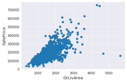 异常值处理:选择对房屋价格影响较大的面积变量"GrLivArea"与目标变量 "SalePrice"的关系进行数据可视化(散点图),可以看到存在两个明显的异常值点(房屋面积极大但是房价极低,不符合业务常识),如下图所示: