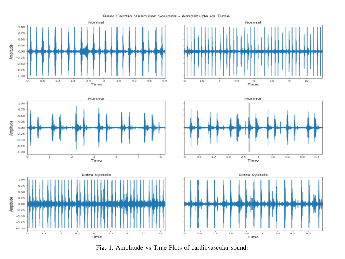 杂音可以是收缩性的,也可以是舒张性的。当心腔之间的血液流动不规则时,就会发生这种情况,这会在收缩期或舒张期产生噪音。杂音出现在S1和S2音之间,在实际心音中很少重叠。分别在S1或S2结尾处出现的规律性增加的lub或dub音可归类为额外心音。听起来像“lub-lub-dub”或“lub-dub-dub”。它有时可能是疾病的指标,但也可能是正常情况。心音的早搏模式包括随机添加或不添加lub或dub音。需要指出的是,与额外心音类别中的常规额外声音不同,额外收缩音是随机添加或删除的。早搏音可能是也可能不是疾病的症状。早搏常见于儿童,有时也可见于成人。数据的视觉分析有助于指出每个类别之间的差异。图1显示了不同心音之间的模式差异。
