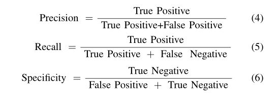 作为一个多类别的分类问题,模型评估的一些合适的度量是分类准确度、精确度、召回率、特异性、AUROC等。精确度和召回率分别关注真实的正面和真实的负面,因此,有助于在不平衡的数据集中产生见解。ROC测量下的面积显示了模型区分不同类别的能力。AUROC分数是在精确度和召回率的帮助下计算出来的,因此也可以作为不平衡数据集的稳健指标。精确性、召回率和特异性的方程分别显示在方程#4、5、6中。