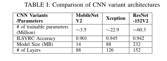 虽然常见的CNN体系结构可以为某些数据集带来良好的性能,但像ImageNet挑战这样的复杂问题需要更复杂的网络设计。据观察,叠加更多的卷积、合并层会在某一点之前产生更好的精度,之后添加更多层会导致信息丢失。[4]中比较了一些基于CNN的高效网络。本文比较了精度、操作次数、网络参数数量、训练和测试时间、功率要求、每个网络参数的精度密度等。结果表明,精度较高的模型需要大量的计算时间,而模型参数量较大。因此,需要在参数数量和精度之间进行权衡。本研究旨在以良好的精度分类心音,但也将考虑模型的实际使用。未来的应用可能包括实时环境中的心音分类器,即移动设备;因此,预测速度将非常重要。因此,研究需要在高精度和少量参数之间找到平衡。[12]提出的ResNet和[23]提出的MobileNetV2似乎是这方面的两个很好的体系结构,具有良好的ImageNet精度分数。ResNet152V2[13]和MobileNetV2分别有6000万和350万个可训练参数。该研究还将包括对这两个数据集的MobileNet[14]、InceptionResNetV2[25]和Exception[6]等网络进行实验。表一捕获了一些CNN变体模型的数据点。