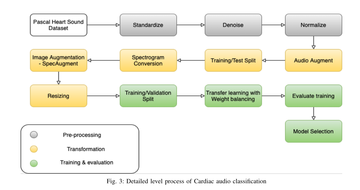 这项研究提出了一种简单的方法来去除音频文件中的噪声,方法是使用低通滤波器来消除192Hz以上的任何声音。这可能已经消除了一些杂音和心音,也可能存在低频外部噪声与低于阈值频率的心音混合的情况。可以研究一种去噪方法来处理这些复杂的场景,从而产生适合分类的去噪音频。数据集A和B由1到30秒不等的音频长度组成。这项研究选择了3秒作为分割每个音频文件的标准,因为整个心音周期应该在这一时间范围内覆盖。任何长度小于3秒的音频都被丢弃,因为它不包含分类所需的足够信息。作为未来的工作,如果这会影响分类性能,可以增加该持续时间,并使用其他值进行试验。目前的研究使用数据集A实现音频增强技术,并使用两个数据集实现频谱图增强技术。作为未来的建议,可以使用数据集B测试时间和基音偏移等音频增强技术。SpecAugmentation可用于为每个原始谱图生成更多频率屏蔽谱图,以检查它是否有助于提高分类性能。音频增强技术,如时间拉伸和音量增益,可以应用于这两个数据集。未来的另一个建议是将输入图像大小从128*128增加到224*224,以实现更好的特征提取。预处理步骤和训练过程需要在高内存配置的GPU环境中执行,以实现这一点。