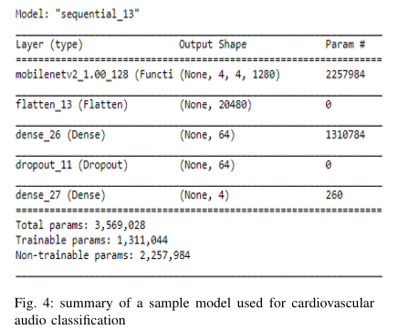 预先训练的网络提取有意义和详细的特征图,然后用于进一步分类。这些特征图需要首先展平,而不影响批量大小。例如,如果特征地图的尺寸为(64*10*10),其中64是批量大小,输入的形状为10*10,则展平层的输出大小为64*100。展平层的输入和输出大小将根据使用的预训练网络而变化。为了阻止神经网络过度拟合,一些正则化技术可用于神经网络,如L1、L2、DropOut等。本研究在两个完全连接的层之间使用DropOut和batch normalization层,只要训练导致模型过度拟合。并不是所有的实验都包括这些层,并被用作需求基础。辍学值为0.2、0.3、0.35等,在不同的体系结构中进行实验。密集层用于处理扁平层的输入,然后通过激活和计算的权重和偏差对其进行转换。然后,这些转换后的信号被传递到另一个密集的完全连接层,以便在两个数据集的心血管音频之间进行分类。第一个全连接层使用整流线性激活函数或ReLU作为激活函数,第二层使用SoftMax作为激活函数。第一个密集层配置为实验32、64、128、500和1000个神经元。数据集A和B分别有4类和3类心血管音频数据。因此,根据输出类别,数据集A和B的最后一层神经元数量分别为4和3。