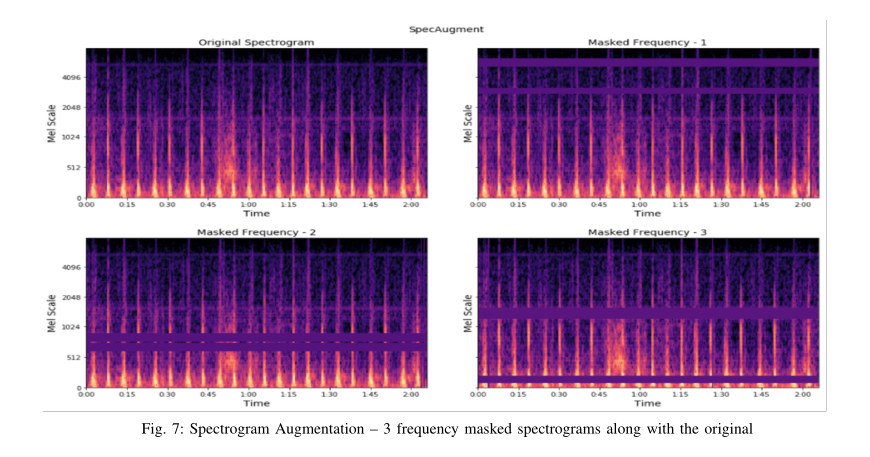众所周知,卷积神经网络在处理大量输入训练数据集时效果最好。这有助于网络学习复杂的非线性函数,从而更好地在看不见的数据集上进行泛化,从而提高精度,并有助于避免过度拟合问题。与图像域数据集相比,心音数据库缺乏高质量的训练数据。解决这个问题的简单而有效的方法之一是数据扩充。[22]探讨了环境声音数据集上的几种音频增强技术及其对整体准确度得分的影响。试验的技术包括时间拉伸、音调偏移、动态范围压缩和添加背景噪声。在转换成mel谱图之前,所有这些增强都直接应用于音频。模型显示,无论数据增加在哪里,精确度都提高了16%。对结果的进一步分析发现,尽管增强总体上提高了某些类的每类准确度,但由于一些重叠的特征,它有所降低。因此,这项研究基于这些发现提出了面向未来实验的类扩展。由于生成的光谱图是一种图像表示,因此还可以使用几种图像增强技术来减少过度拟合。一些常见的图像增强技术包括随机旋转、随机裁剪、水平翻转和仿射变换。[9] 引入了一种新的方法,他们称之为CutOut。这项技术随机屏蔽图像中的方形区域以增强图像。将该方法应用于输入数据集提高了相关CNN的性能和鲁棒性。与CutOut类似,[29]探索了另一种方法,即删除图像中的矩形空间。这种方法被称为随机擦除,它被证明是一种有效的方法,可以避免过度拟合,提高基于CNN模型的泛化能力。[15]探索了另一种有效的图像增强方法——样本配对,该方法将一幅图像与从训练数据集中随机选择的另一幅图像合并。将两幅图像的像素随机组合以生成样本图像的方法称为混搭(MixUp),该方法已在[26]中探索过。这里需要注意的一点是,采样配对是混合方法的一种特殊情况,其中像素混合的比率变为1:1。这两种方法都显示了图像域模型在分类精度方面的显著进步。[20] 在谷歌提出了一种称为SpecAugment的谱图增强技术,该技术简单且计算成本低廉。该方法包括时间包装、基于时间和频率掩蔽的增强。时间缠绕是指扭曲频谱图时间序列的X轴(时间)。时间掩蔽是指掩蔽一组连续的时间步,而频率掩蔽是指掩蔽频谱图中的频率通道。该方法已通过ASR(自动语音识别)网络的语音识别问题进行了测试,并通过[19]项任务获得了LibriSpeech 960h和[10]项任务获得了交换机300h的最新结果。研究中指出的一个要点是,时间包装确实有助于提高模型的性能,但不是一个关键因素。它还指出,增强将过拟合问题转化为欠拟合问题,然后通过设计更长的网络或进行更长时间的训练等常用方法来解决。