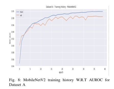 MobileNet网络作为预训练层,然后进行平坦化和两个密集层,也可以获得良好的分类结果。它以0.001的学习率实现了Adam优化器,并为ImageNet预先训练的MobileNet网络重用现有权重。模型培训期间未使用辍学或批量标准化。该实验被配置为15个阶段,但在第12个阶段获得了最佳结果。结果测试指标为测试损失为0。5142,分类准确度为0.8767,精密度为0.8767,召回率为0.8767,AUROC为0.9629。ImageNet预先训练了MobileNet V2网络,以及两个完全连接的层,使用与MobileNet网络类似的设置进行实验。在使用随机梯度下降优化器、0.001倾斜率和0.9动量值执行训练过程的情况下,发现了最精细的模型。作为一个正则化步骤,当输入从上一个包含64个神经元的密集层传递到最后一个分类层时,使用0.3的退出值。当在数据集A的训练过程中未更新现有的预训练权重时,观察到最佳结果。使用所述配置设置了40个历元,并在第33个历元发现了最高结果。测试损失为0.4516,分类准确率为0.8767,精密度为0.8873,召回率为0.863,AUROC为0.9585。由于年代较少,MobileNet所需的培训时间比MobileNet V2少。图8显示了基于MobileNet V2的AUROC评分模型的培训历史。