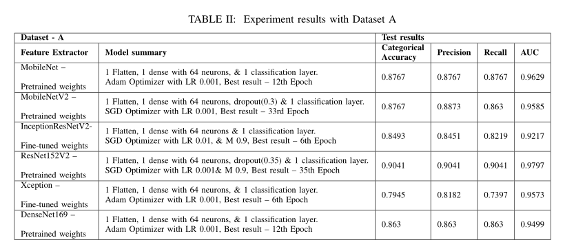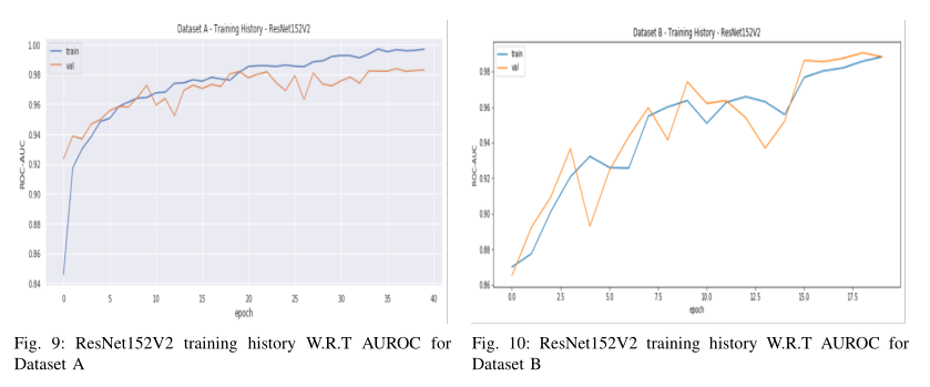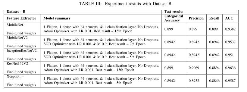 其他经过评估的预训练特征提取器包括MobileNet、InceptionResNetV2和Exception以及分类网络。所有进行的实验都得出结论,基于ResNet152V2的模型对数据集B的分类效果最好。使用该模型进行的测试数据评估的AUROC为0.96,分类准确度为0.9069。MobileNetV2和基于异常的网络都可以被视为数据集B的良好分类器,因为它们的AUROC得分为0.95,分类准确率为0.894。当预先训练好的网络的所有层都被适当地微调时,数据集B的所有实验结果都会更好。这可能是因为基于体重的减肥计算,而数据集中的训练过程包含严重的班级不平衡。表3显示了使用数据集B对所有经过预训练的基于视觉域的神经网络进行实验的验证和测试分数。