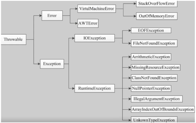 错误:错误不是异常,而是脱离程序员控制的问题。错误在代码中通常被忽略。例如,当栈溢出时,一个错误就发生了,它们在编译也检查不到的。
