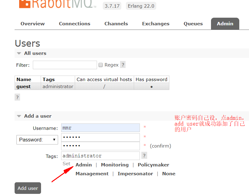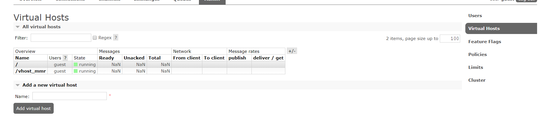 4. virtual hosts<->mysql中的数据库,一般以/开头,然后对用户进行授权,右边栏中有virtual hosts,进行授权,授权完毕,就可以用自己的账户密码了
