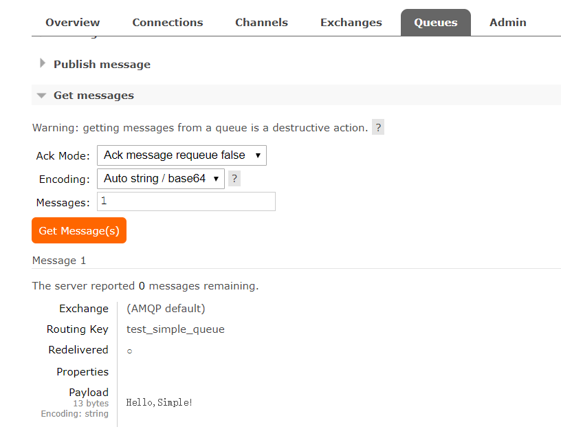 运行完毕进行验证,在你的rabbitmq里的Queues,进入你的/vhost_mmr的test_simple_queue里