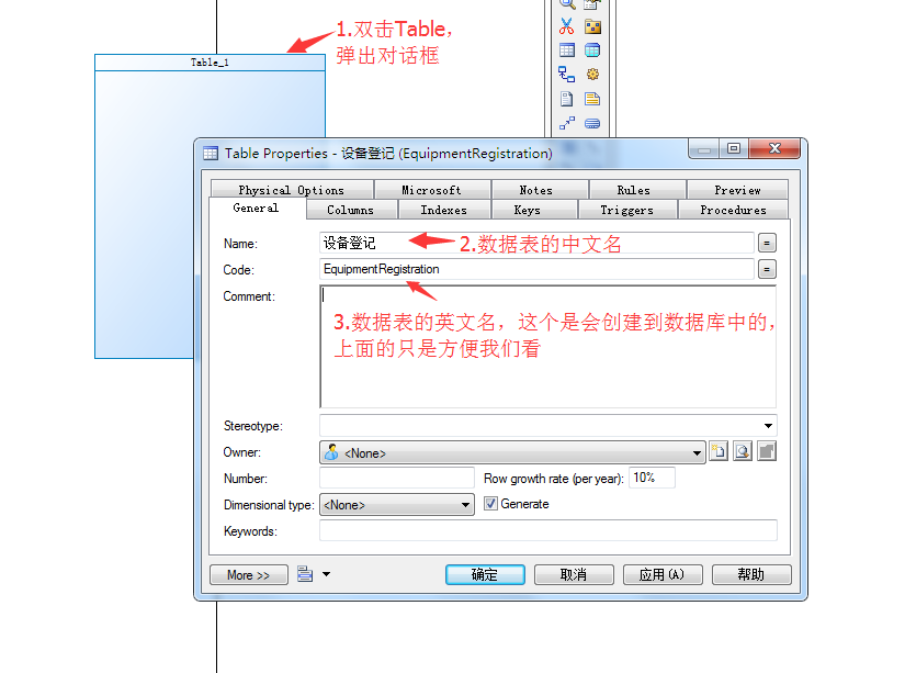 3.3 模型创建成功下面来创建数据库表:双击Table----填写数据库的表名(Name可以是中文名,方便我们看,Code必须是有意义的英文名,这个字段创建到数据库中的)