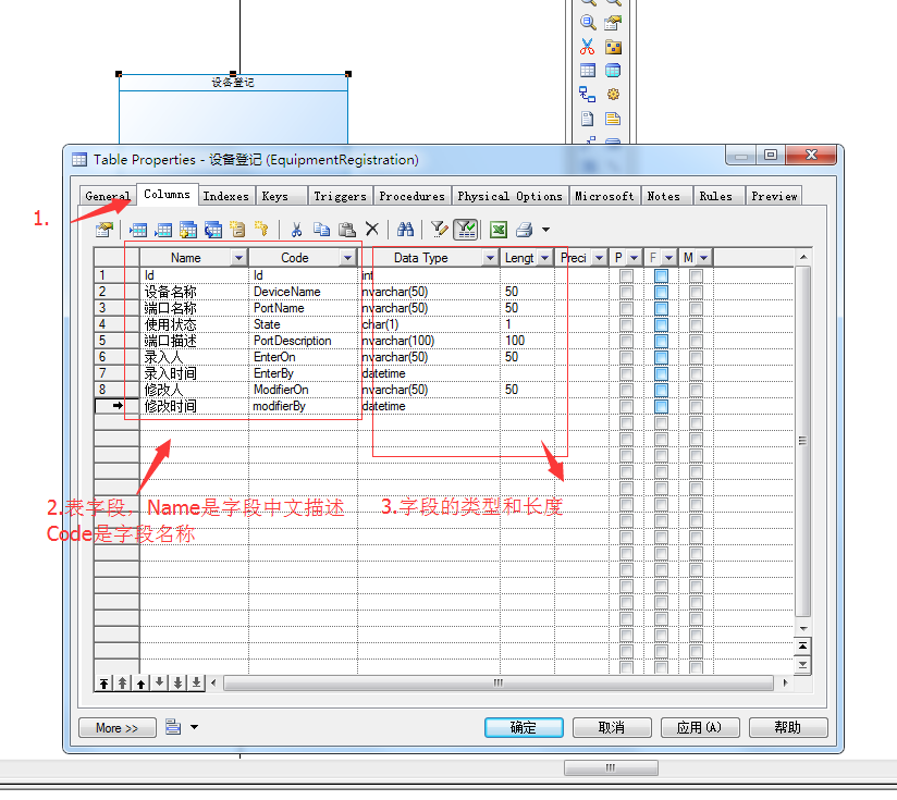 3.4 数据库表创建成功,下面来创建数据表中的字段 :注意:Name是中文描述,Code是真正的字段名称,DateType是字段类型,字符型一般选择nvarchar(长度),这个意思是如果没有数据就不会