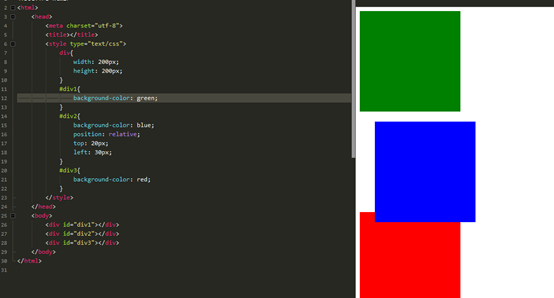 可以看出div2是相对于原有位置进行left、right、top、bottom进行位移,而且对后面的元素(div3)没有任何影响