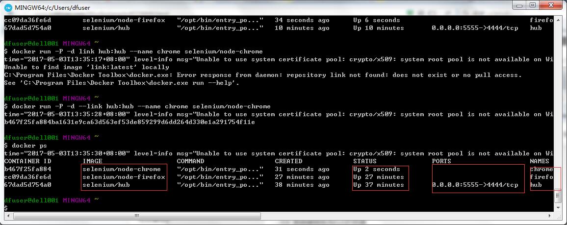 docker run -P -d --link hub:hub --name chrome selenimu/node-chrome