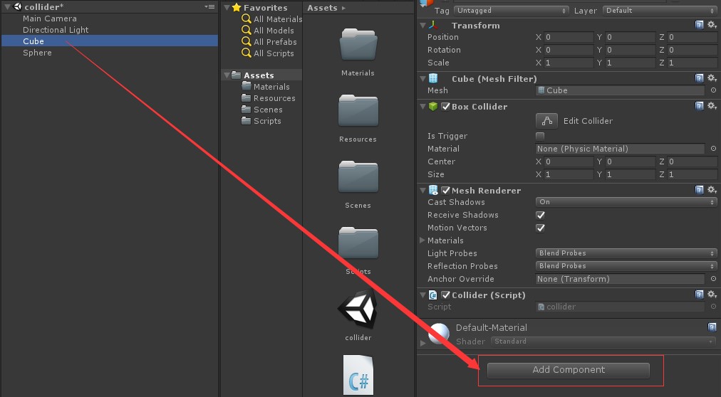 首先在场景中创建一个Sphere和一个Cube,它们都是默认带有碰撞器的。