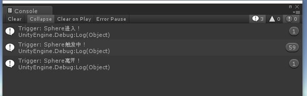 勾选Cube的BoxCollider的IsTrigger,运行游戏。用鼠标拖到Sphere去碰撞Cube,可以看到如下信息: