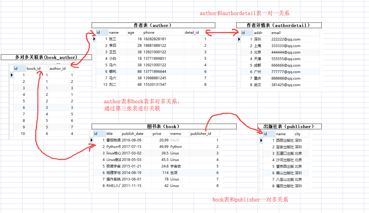 class Book(models.Model): title = models.CharField(max_length=32) publish_date = models.DateField(auto_now_add=True) price = models.DecimalField(max_digits=5, decimal_places=2) memo = models.TextField(null=True) # 创建外键,关联publish publisher = models.ForeignKey(to="Publisher") # 创建多对多关联author author = models.ManyToManyField(to="Author") def __str__(self): return self.title # 出版社 class Publisher(models.Model): name = models.CharField(max_length=32) city = models.CharField(max_length=32) def __str__(self): return self.name # 作者 class Author(models.Model): name = models.CharField(max_length=32) age = models.IntegerField() phone = models.CharField(max_length=11) detail = models.OneToOneField(to="AuthorDetail") def __str__(self): return self.name # 作者详情 class AuthorDetail(models.Model): addr = models.CharField(max_length=64) email = models.EmailField()