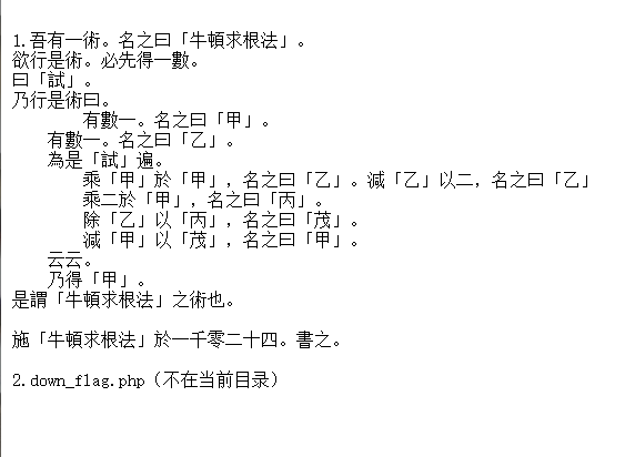 推测运行结果是关键密码,,进入down_flag.php页面,开始下载一个flag.zip文件,解压时会报错,利用WinRAR软件可以修复,再次解压发现需要密码才能打开,输入上面的output,就可以打开文件,里面是个flag.txt文件,内容即为flag: