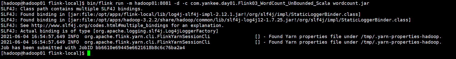 -c com.yankee.day01.Flink03_WordCount_UnBounded_Scala wordcount.jar