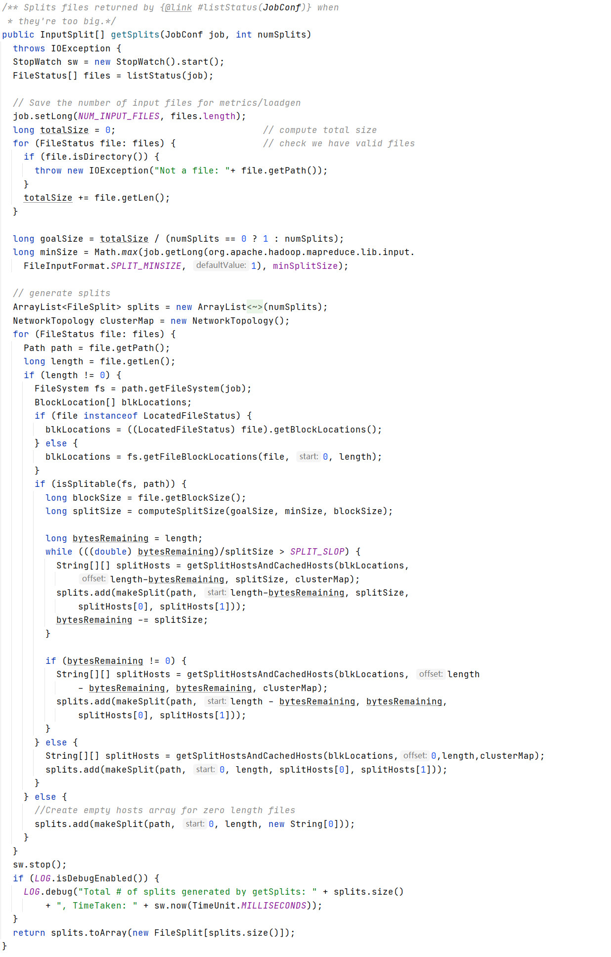 读取文件数据时,数据是按照Hadoop文件读取的规则进行切片分区,而切片规则和数据读取的规则有些差异,具体Spark核心源码如下: