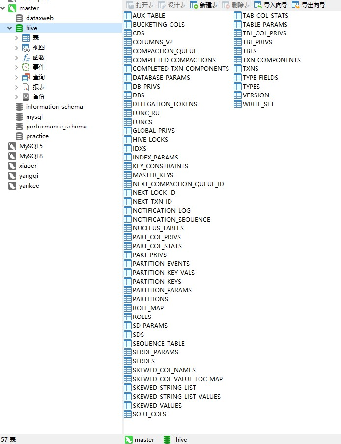 Hive的元数据一般选择放在关系型数据库中,自带的数据库是Derby,我将Hive的元数据信息存放在MySQL数据库中,对应的hive数据库中,共57张表。