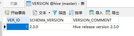 元数据表字段 说明 示例数据 VER_ID ID(主键) 1 SCHEMA_VERSION Hive-Schema版本 2.3.0 VERSION_COMMENT 版本说明 Hive release version 2.3.0