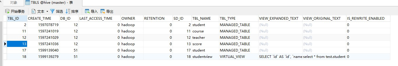 元数据表字段 说明 示例数据 TBL_ID 数据表ID 18 CREATE_TIME 创建时间 1599139279 DB_ID 数据库ID 51 LAST_ACCESS_TIME 上次访问时间 0 OWNER 所有者 hadoop RETENTION 保留字段 0 SD_ID 序列化配置信息 18 TBL_NAME 表名 studentview TBL_TYPE 表类型 VIRTUAL_VIEW VIEW_EXPANDED_TEXT 视图的详细HQL语句 SELECT `id` AS `id`, `name` AS `name`, `sex` AS `sex` FROM (select `student`.`id`, `student`.`name`, `student`.`sex` from `test`.`student`) `test.studentView` VIEW_ORIGINAL_TEXT 视图的原始HQL语句 select * from test.student IS_REWRITE_ENABLED 0 -