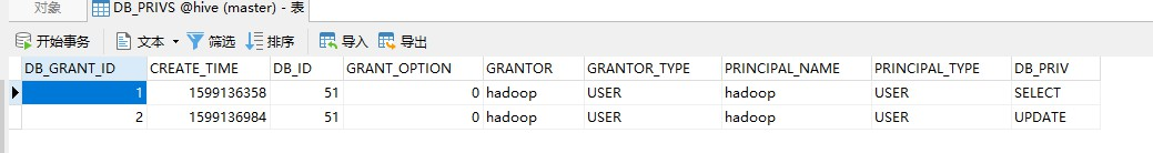 元数据表字段 说明 示例数据 DB_GRANT_ID 授权ID 1 CREATE_TIME 授权时间 1599136358 DB_ID 数据库ID 51 GRANT_OPTION 授权选项 0 GRANTOR 授权用户 hadoop GRANTOR_TYPE 授权用户类型 USER PRINCIPAL_NAME 被授权用户 hadoop PRINCIPAL_TYPE 被授权用户类型 USER DB_PRIV 数据库权限 SELECT
