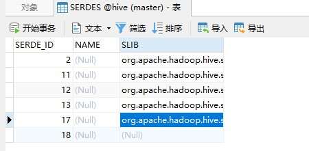 元数据表字段 说明 示例数据 SERDE_ID 序列化类配置ID 17 NAME 序列化类别名 SLIB 序列化类 org.apache.hadoop.hive.serde2.lazy.LazySimpleSerDe -
