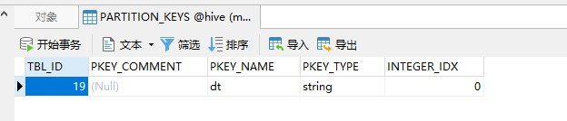 元数据表字段 说明 示例数据 TBL_ID 数据表ID 19 PKEY_COMMENT 分区字段注释 PKEY_NAME 分区字段名称 dt PKEY_TYPE 分区字段类型 string INTEGER_IDX 分区字段顺序 0 -