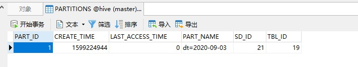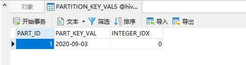 元数据表字段 说明 示例数据 PART_ID 分区ID 1 PART_KEY_VAL 分区字段值 2020-09-03 INTEGER_IDX 分区字段顺序 0 -