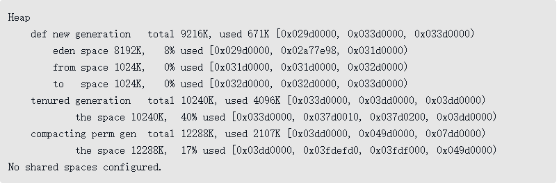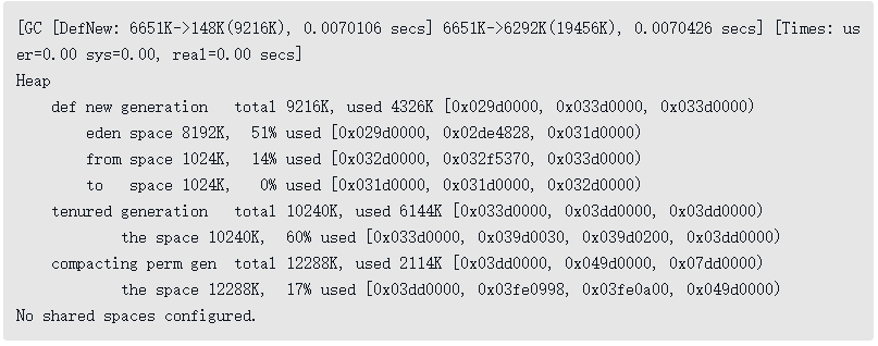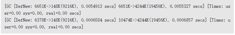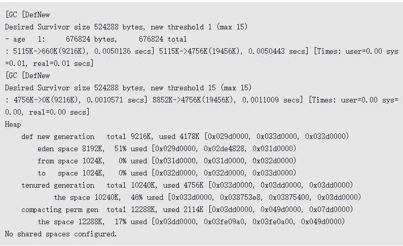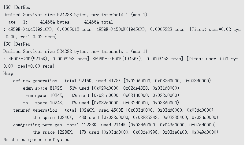 这次收集结束后,4MB的allocation4对象顺利分配在Eden中。因此程序执行完的结果是Eden占用4MB(被allocation4占用),Survivor空闲,老年代被占用6MB(被allocation1、2、3占用)。通过GC日志可以证实这一点。代码清单3-7 新生代Minor GC