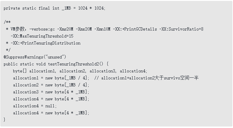 读者可以试试分别以-XX:MaxTenuringThreshold=1和-XX:MaxTenuringThreshold=15两种设置来执行代码清单3-9中的testTenuringThreshold()方法,此方法中allocation1对象需要256KB内存,Survivor空间可以容纳。当-XX:MaxTenuringThreshold=1时,allocation1对象在第二次GC发生时进入老年代,新生代已使用的内存在垃圾收集以后非常干净地变成0KB。而当-XX:MaxTenuringThreshold=15时,第二次GC发生后,allocation1对象则还留在新生代Survivor空间,这时候新生代仍然有404KB被占用。
