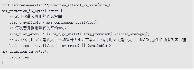 在JDK 6 Update 24之后,这个测试结果就有了差异,-XX:HandlePromotionFailure参数不会再影响到虚拟机的空间分配担保策略,观察OpenJDK中的源码变化(见代码清单3-12),虽然源码中还定义了-XX:HandlePromotionFailure参数,但是在实际虚拟机中已经不会再使用它。JDK 6 Update 24之后的规则变为只要老年代的连续空间大于新生代对象总大小或者历次晋升的平均大小,就会进行Minor GC,否则将进行Full GC。代码清单3-12 HotSpot中空间分配检查的代码片段